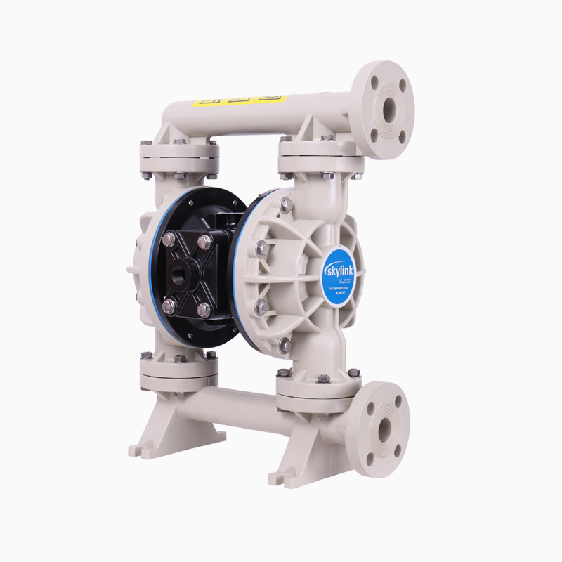 SKYLINK气动隔膜泵广泛应用于喷涂、电镀、造纸、电力、陶瓷、化工、日化、电子、食品采矿、污水处理、纺织、汽车制造以及各种公用事业上,可以输送各种不同材质的流体,可以变换不同的泵体和膜片组合来应对不同特性的强酸、强碱及各种腐蚀性液体,具有移动方便,使用安全的特性。 无旋转性零件(或轴承),无机械轴封,无连接器,维修费用低, 可通过改变气量而改变输送速度,可通过改变压力而改变输送。